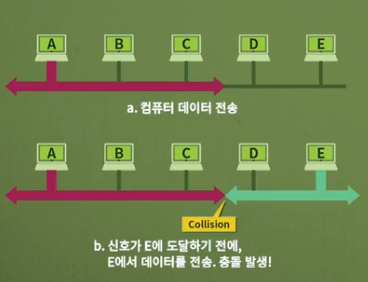 - 여러 시스템에서 전송하면 충돌(collision)이 가능하며, 해당 프레임은 손상되어 재사용 불가능